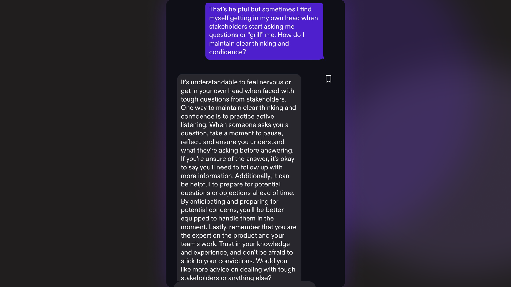Mentors, friends, and even the best human product coaches aren’t always available to help you think through a pressing situation at work on demand. Pacey is there in the moment and responds in seconds.