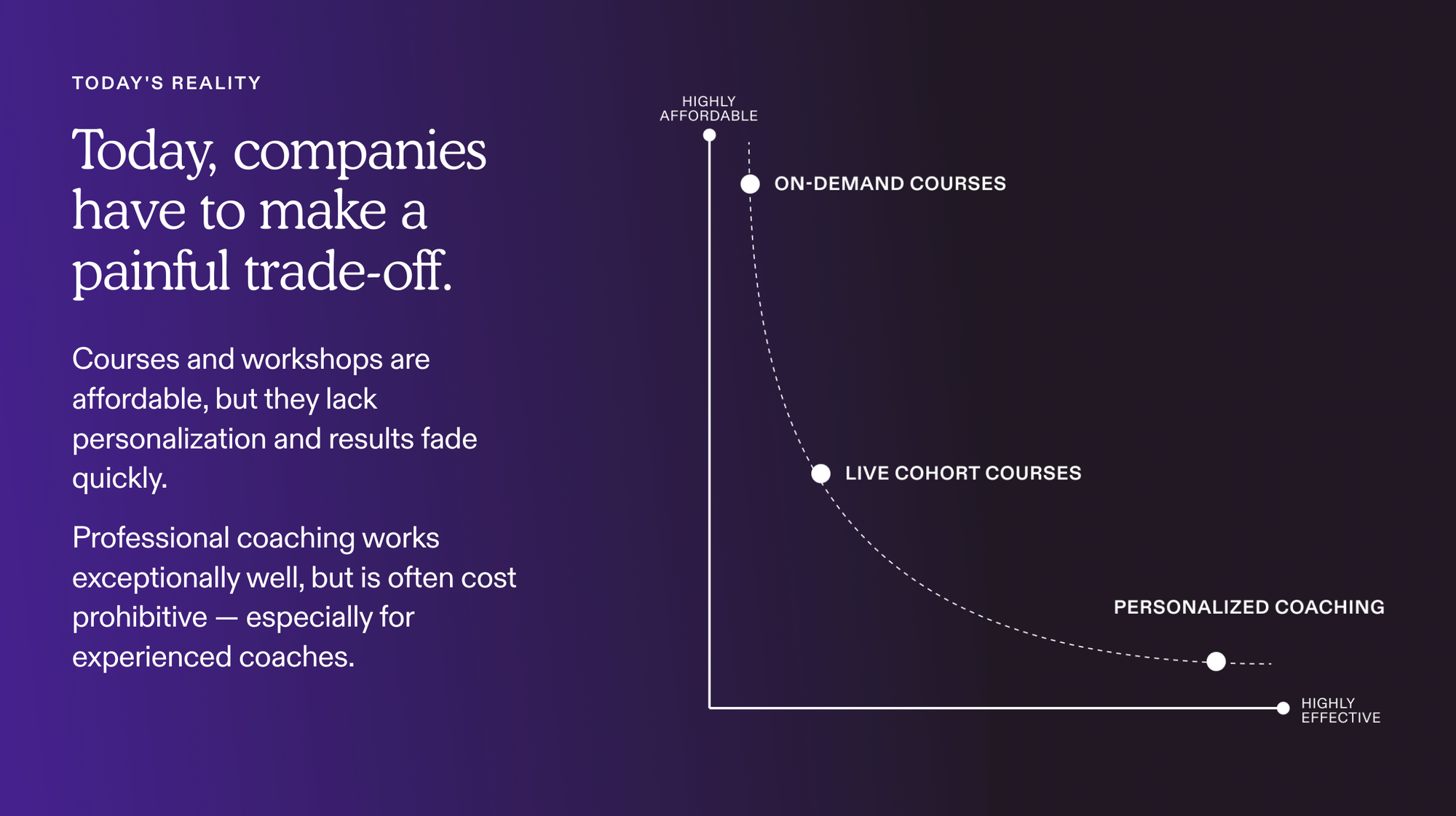 Why? Today, companies have to make a painful trade-off. Courses and workshops are affordable, but they lack personalization and results fade quickly. Professional coaching works exceptionally well, but is often cost prohibitive.